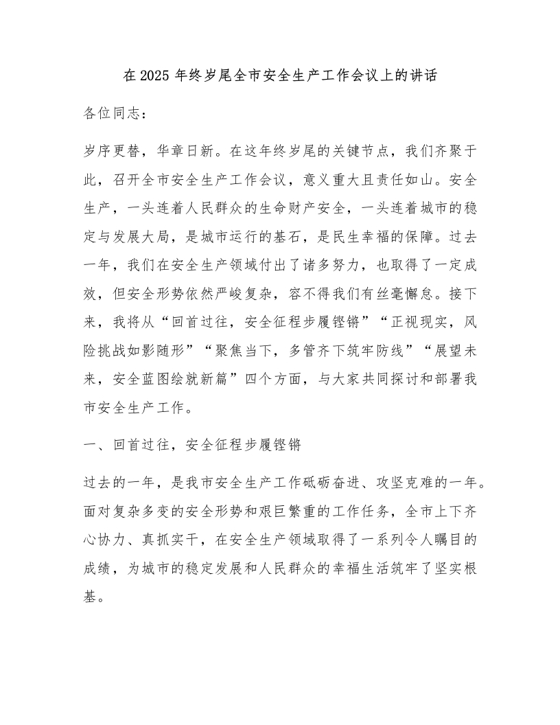 首页安全文档综合在2025年终岁尾全市安全生产工作会议上的讲话