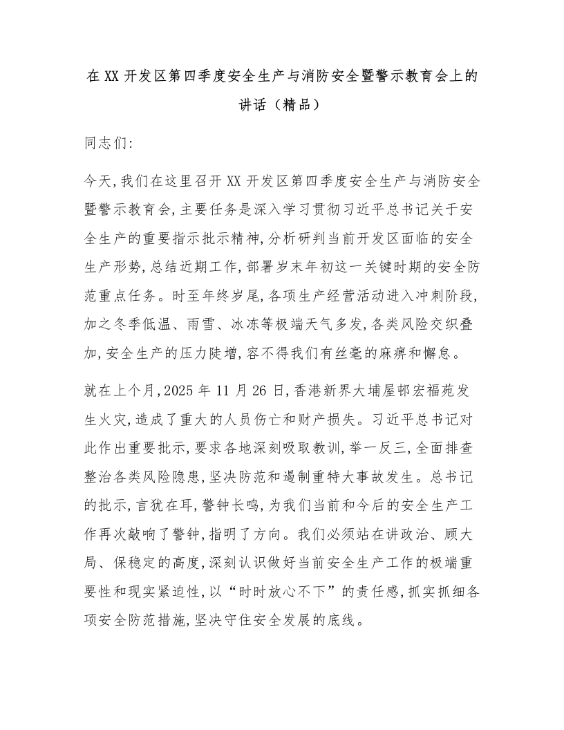 在XX开发区第四季度安全生产与消防安全暨警示教育会上的讲话(精品)
